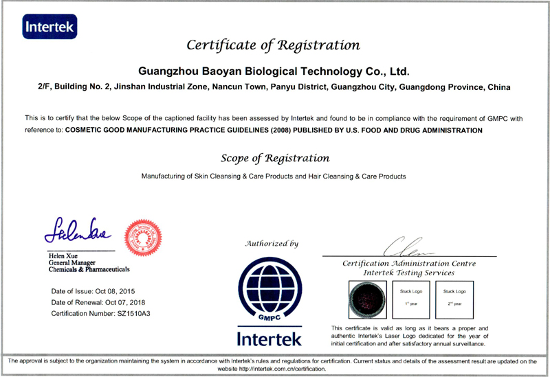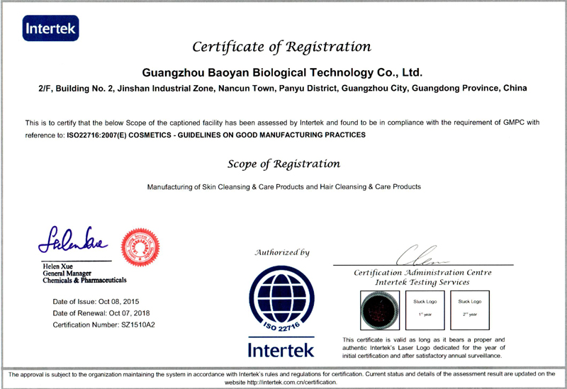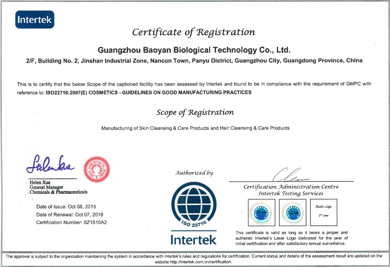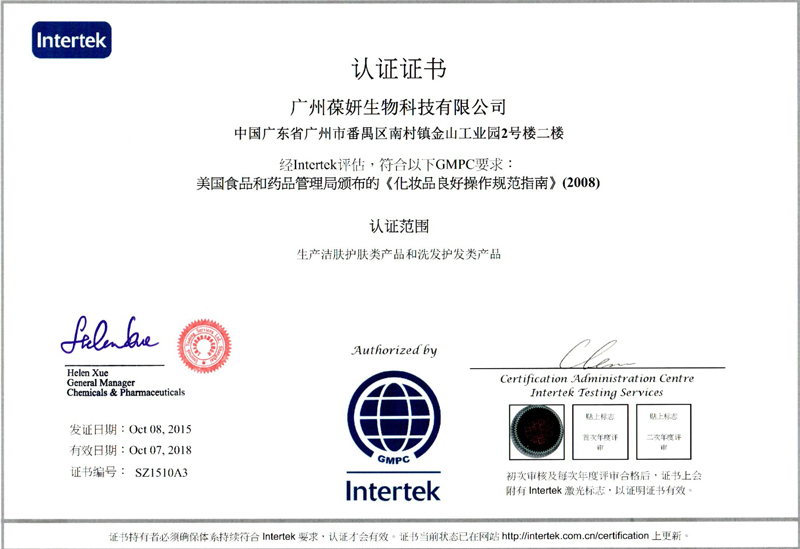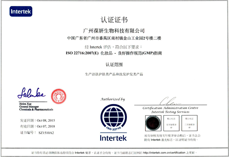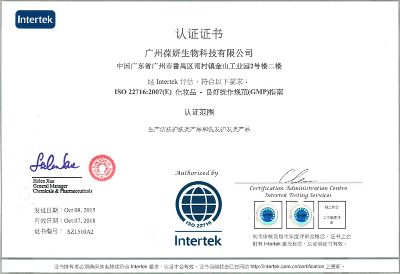 九游体育的护肤生产车间是严格按照GMPC认证所需要的条件进行建设,并一次性通过ISO 22716、ISO9001、ISO14000、OHSAS18000的体系认证,是一家同时获得欧盟和美国双重标准的GMPC认证企业、历年均通过屈臣氏审核。